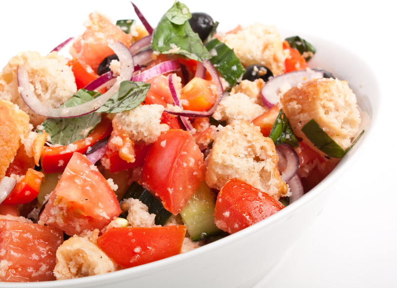 Tagliare il pane a fette e farle inzuppare in acqua fredda e aceto per qualche minuto, quando saranno ammorbidite strizzarle bene con le mani e sbriciolarle in un’insalatiera. Aggiungere i pomodori a pezzetti, la cipolla a fettine sottili, il basilico, il cetriolo e condire con olio Toscano, sale e pepe, amalgamando bene il tutto e facendolo riposare in frigorifero.